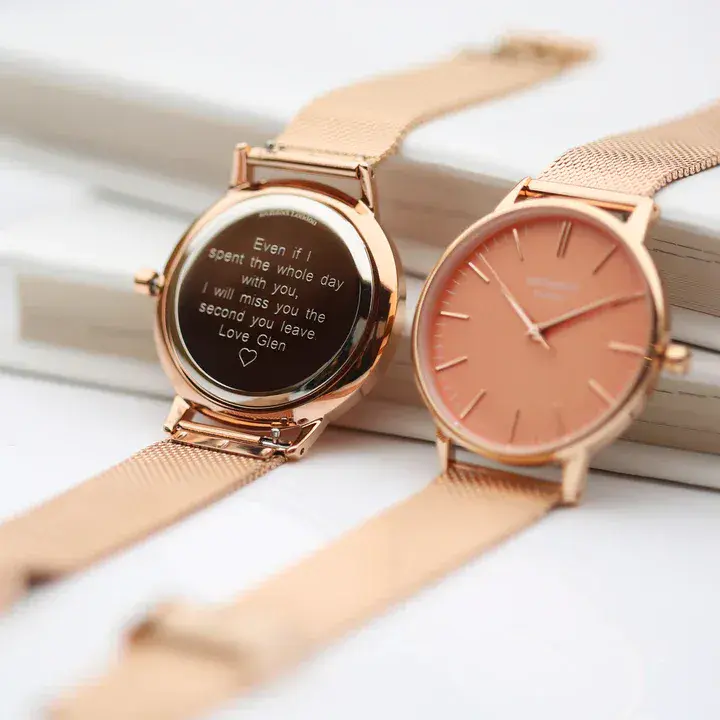 The back of the watch was specifically designed to have the ideal space for an engraved message of your choice. Just provide us with your wording and we will perfectly engrave it using a modern font. Or upload a photo of your own handwritten message or drawing.